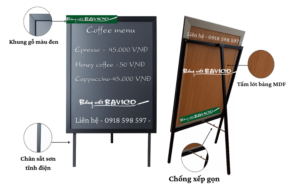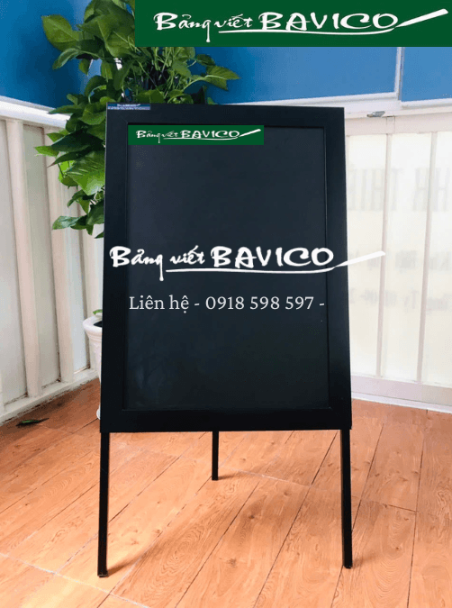 Thiết kế: khung sắt vuông sơn tĩnh điện đen mờ, hai mặt bảng song song, có thể viết nội dung khác nhau. Hình chữ A bằng sắt chống rỉ được sơn tĩnh điện màu đen, chống trầy rất cứng.